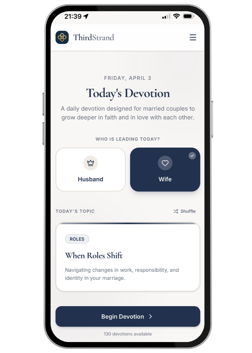 Third Strand is a daily devotion app designed for married couples to grow deeper in faith and in love with each other.